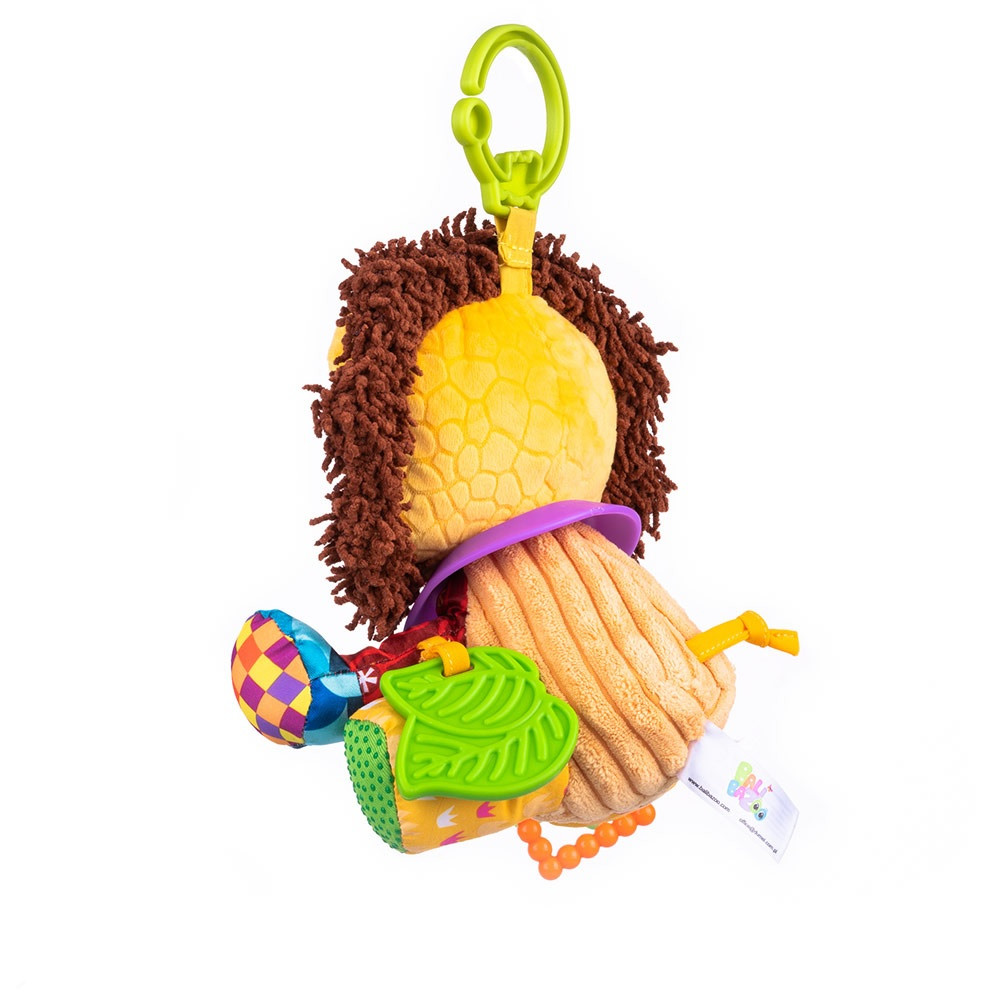 Puha, bababarát anyaga és a különböző textúrák segítik a kicsi érzékszerveinek fejlődését. Élénk színei és kedves arca azonnal felkeltik a baba érdeklődését, a csörgő és a mozgó elemek pedig játékra ösztönzik.