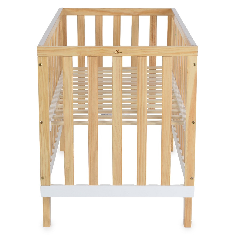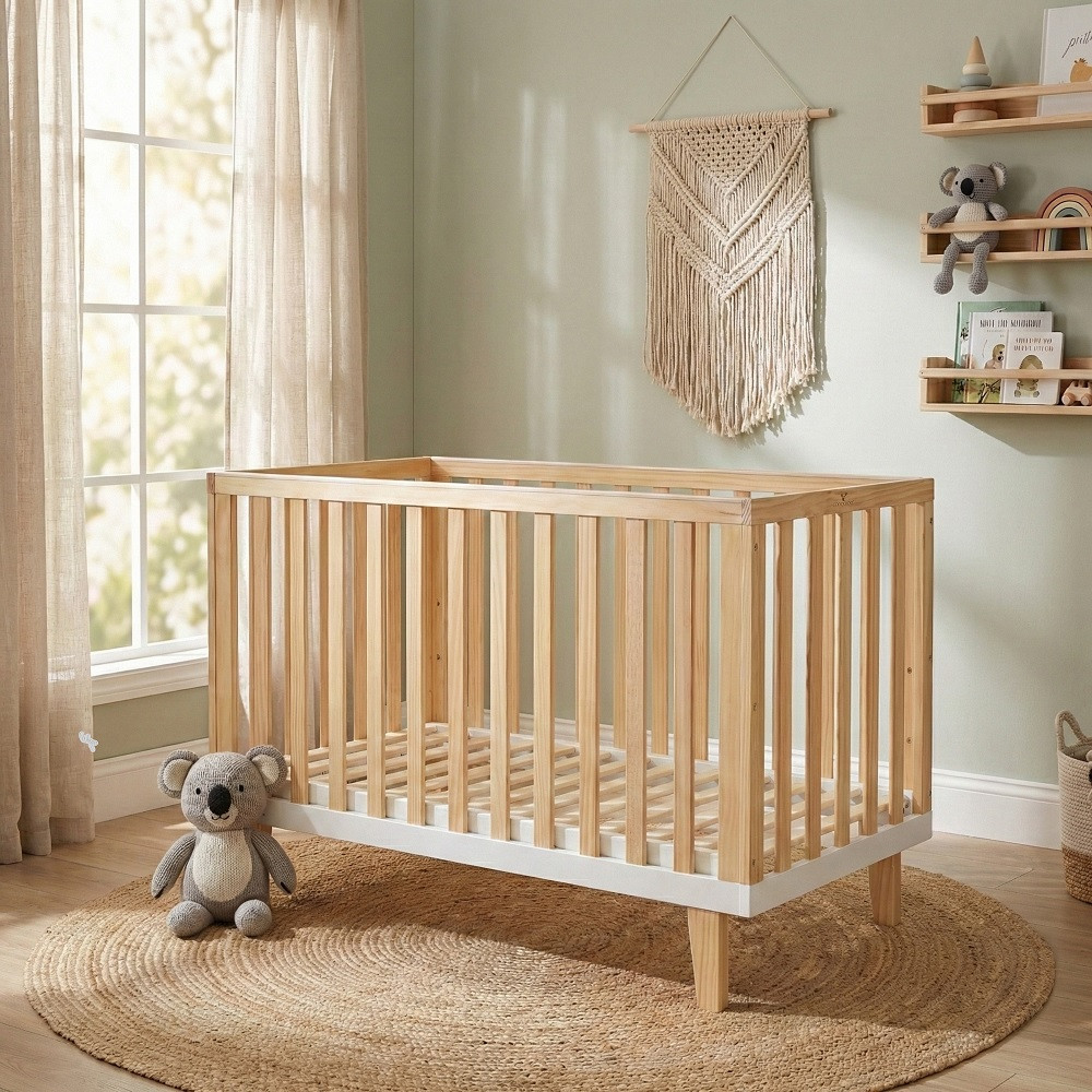 A kiságy tömör fenyőfából készült, amely kiváló tartósságot és stabilitást nyújt. A masszív felépítés biztosítja, hogy a baba biztonságos környezetben pihenhessen, miközben a natur szín meleg, otthonos hangulatot teremt a gyerekszobában.