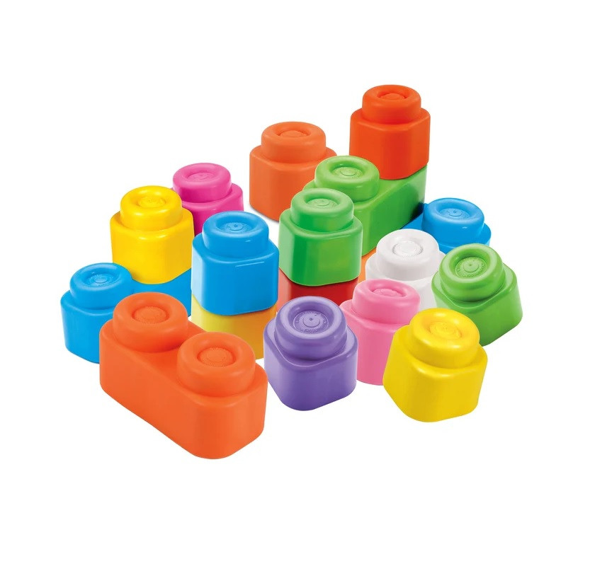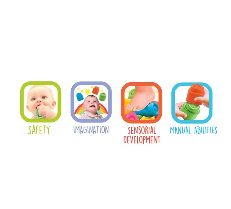 - Puha építőkockák: A rugalmas, puha műanyag kockák biztosítják, hogy a gyermek játék közben ne sérüljön.