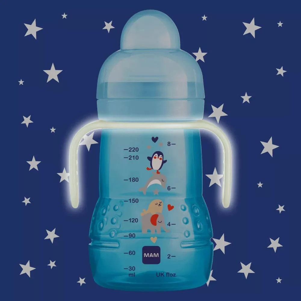 Ez a tanulópohár élménnyé varázsolja az első önálló ivást – még az éjszakai órákban is. A világító fogantyú nemcsak praktikus, hanem játékosságot is csempész a rutinba. A MAM jól ismert minősége és az orvosszakértőkkel való együttműködés garantálja, hogy a termék minden szempontból biztonságos és megbízható legyen.