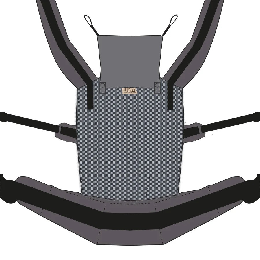 A széles, formatartó derékpánt stabil alátámasztást ad, míg a párnázott vállpántok csökkentik a vállra nehezedő nyomást. A bővíthető vállpánt kialakítás lehetővé teszi, hogy több hordozó személyhez is könnyen igazítható legyen.