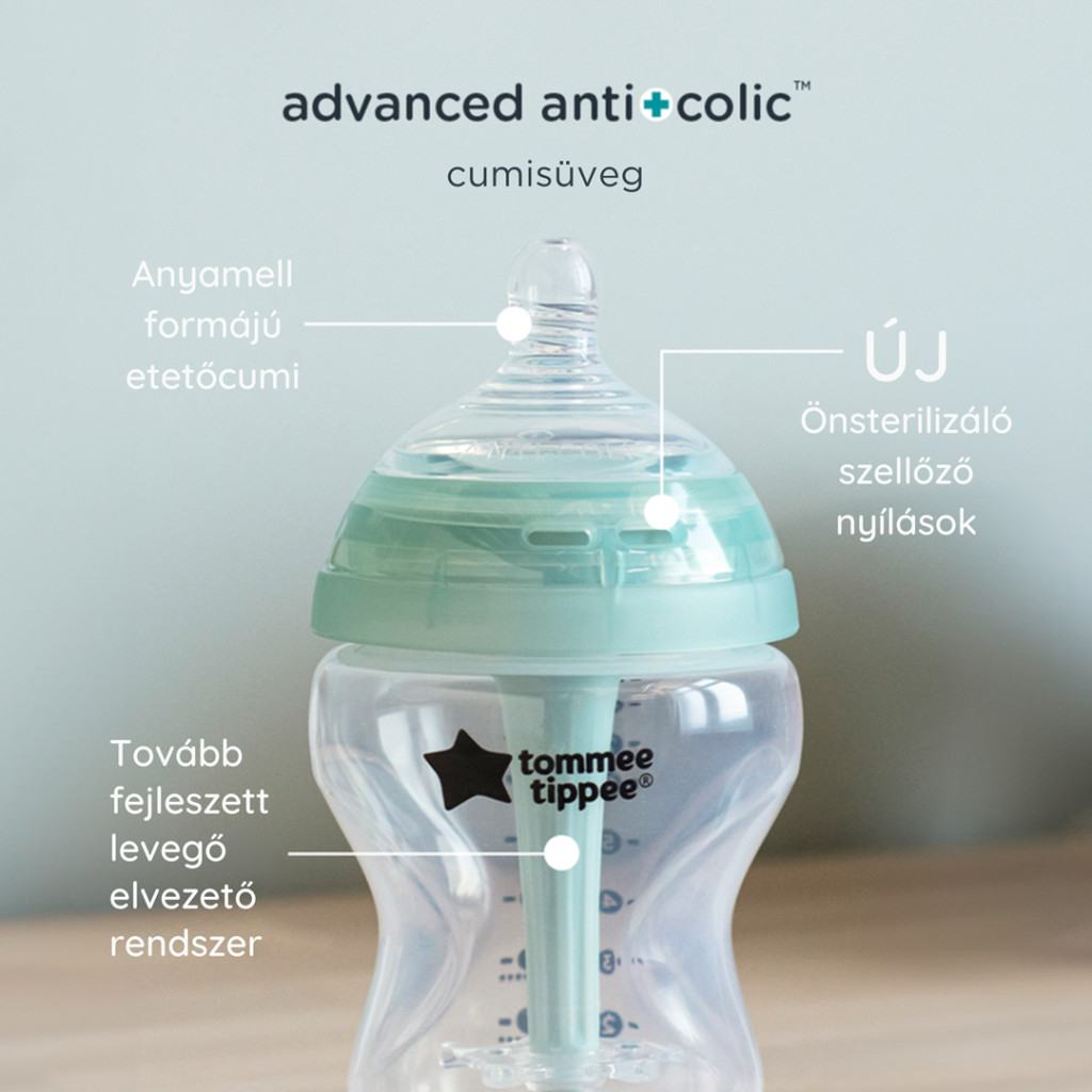 A Tommee Tippee Advanced Anti-Colic cumisüveg kezdőszett kifejezetten a hasfájós, levegőnyelésre hajlamos babák számára lett kifejlesztve. Az egyedi levegőelvezető rendszer segít csökkenteni a hasfájás, puffadás és sírás kellemetlen tüneteit – hogy az első hónapok valóban a kötődésről és a nyugalomról szóljanak.